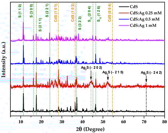 The incidence of doping on the crystallization of Ag-doped CdS and CdS thin films is examined by X-ray diffraction technique. Figure 3 exhibits the XDR patterns of CdS and CdS:Ag thin films for a 2θ diffraction angle varying from 5° to 80°. The presence of multiple peaks in the XDR pattern indicates that the thin films are polycrystalline in nature, and consist of fine and coarse grains. The diffraction peaks of all samples are found to agree well with the standard ICDD card (# 041-1049) of the hexagonal (wurtzite) structure of CdS with space group (P63mc). The peaks indexed to the (1 0 1), (1 0 2) and (0 0 4) planes correspond to this card, confirming the crystallization of CdS in all samples. In all XDR patterns, intense peaks are also observed at , , , and , corresponding to the monoclinic phase of sulfur (S) according to ICDD card (# 76-0183), with other peaks located at , corresponding to the orthorhombic phase of sulfur according to ICDD card (# 74-0791). This indicates that the synthesized films have high sulfur content.