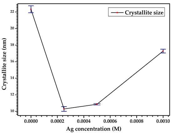 The nanostructural nature of the CdS and CdS:Ag thin films was investigated using Equation (1). The lower-bound estimates for the crystallite size (D) for the thin films are 22.33 ± 0.42 nm, 10.29 ± 0.28 nm, 10.86 ± 0.09 nm and 17.28 ± 0.23 nm for the CdS, CdS doped to 0.25 mM, 0.5 mM and 1 mM Ag samples, respectively. Figure 4 shows the effect of Ag doping concentration on the crystallite size of the polycrystalline thin films. It is expected that the crystallite size of the doped samples is different and in this case lower than that of the pure CdS sample. This suggests that the incorporation of AgNO3 as doping increases the reaction rate, which accelerates crystal formation. For the concentrations of 0.25 mM and 0.5 mM, the crystallite size decreases, maintaining a relatively close value. However, when the concentration is very high, the crystals will precipitate faster and agglomerate to give rise to the formation of Ag host clusters [34].