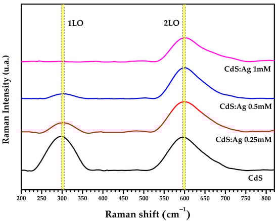 Figure 5 shows the Raman spectra of the Ag-doped CdS and CdS thin films in the range from 200 to 800 cm−1. Two distinct Raman peaks are visible in the spectra for all the thin films except for the CdS:Ag 1 mM film, which shows only one characteristic peak. The first Raman peak in the region around 300 cm−1 is identified as the first longitudinal optical phonon vibration (1LO), while the Raman peak around 600 cm−1 is the second longitudinal optical phonon (2LO). The locations of the 1LO and 2LO Raman peaks for all samples are reported in Table 2. These peaks of polycrystalline CdS thin films are consistent with that reported for the hexagonal structure of CdS, whose first and second frequencies of the 1LO and 2LO modes are generally found around 305 cm−1 and 604 cm−1 [35,38,39,40]. Close values have also been reported for the cubic structure of CdS in more recent studies [17,41], hence the limitation of being able to index the crystal structure from these peaks.