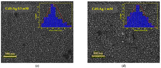 On the other hand, in the Ag-doped CdS films, granular nanostructures with undefined morphologies are observed, with a decrease in grain size with respect to the pristine CdS thin film. The average grain sizes for the 0.25 mM and 0.5 mM doped samples were 21 nm, while for the 1 mM doped sample, it was 38 nm. In Figure 6b,c, the films doped with Ag are at 0.25 mM and 0.5 mM correspondingly, and it is observed that the particle density grows uniformly and adheres homogeneously to the substrate; however, the CdS:Ag sample at 1 mM (Figure 6d) presents a polydispersion of the size and a remarkable separation between the boundary of the granules. For solar cell applications, this aspect is especially important, since grain boundaries and surface homogeneity have a direct effect on the recombination of the film with the constituent layers of the heterostructure and, thus, on the energy conversion efficiency [27,36,50]. In this sense, CdS:Ag thin films at 0.25 mM and 0.5 mM could exhibit the best morphological properties for this application.