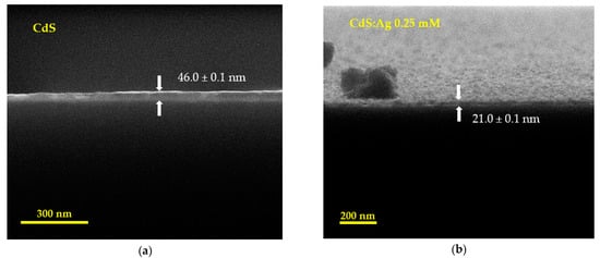 As for the thickness of the layers, Figure 7a shows the SEM micrograph of the cross-section of the CdS thin film. This image was obtained at a scale of 300 nm, with a beam of 20.00 kV and a magnification of 200,000×. The thin film was found to be approximately 46.0 ± 0.1 nm thick. On the other hand, for the sample doped with Ag at 0.25 mM (Figure 7b), the thickness was 21.0 ± 0.1 nm and this value was not significantly modified for the other doping concentrations.