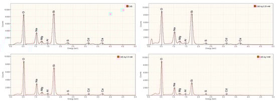 The energy dispersive spectroscopy (EDS) technique provided the semi-quantitative analysis of the chemical composition of the CdS and CdS:Ag thin film samples. Figure 8 presents the EDS spectra of the doped CdS and CdS thin films. These spectra confirm the presence of the expected elements cadmium (Cd) and sulfur (S) in all the prepared samples, in addition to the elements silicon (Si), oxygen (O) sodium (Na), aluminum (Al), magnesium (Mg), calcium (Ca), attributed to the soda-lime glass substrate [51,52]. The compositional atomic ratios of Cd and S in the thin films are described in Figure 9. It is observed that for the pure CdS thin film, the atomic ratio of cadmium and sulfur is 21.14% and 78.86%, respectively. This is consistent with the presence of elemental sulfur in the diffractograms. The excess sulfur in the CdS thin film can be attributed to the chemical environment of the synthesis, particularly the high content of CS(NH)2 in the precursor solution. The molar concentrations of cadmium (CdCl2, 0.05 M) and sulfur (CS(NH)2, 0.5 M) precursors in the synthesis have a molar ratio of 1:10 (Cd:S), which may confirm the reason for the significant excess of sulfur compared to cadmium.