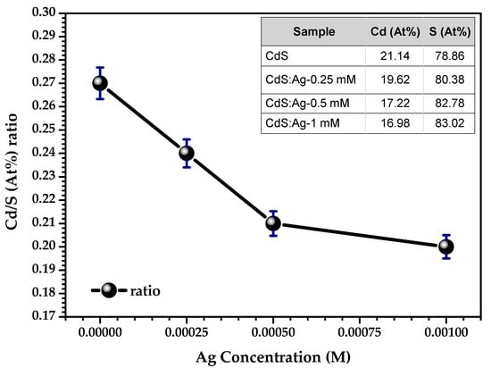 For the doped samples, the Cd/S ratio decreases due to the effect of the doping concentration. The Ag element could not be detected through this technique due to the low doping concentrations. However, according to Figure 9, it was found that the Cd/S ratio decreases significantly with increasing Ag molar concentration. The lowest Cd/S ratio of 0.20 was for the CdS thin film prepared using 1 mM (0.001 M) Ag concentration. This confirms that, for high doping, Ag atoms enter more at the interstitial sites than at the substitution sites [27], which is consistent with that revealed by Raman spectra and XDR analysis. No elements other than those present in the glass were detected, confirming the purity of the grown thin films.