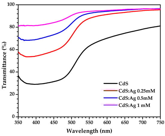 Optical transmittance spectra of CdS and CdS:Ag thin films were obtained to study the effect of silver doping concentration on the optical characteristics of CdS thin films. In Figure 10, the optical transmittance spectra for wavelengths ranging from 350 to 750 nm are shown. The black curve corresponds to the pristine CdS thin film and the red, blue and magenta curves correspond to the silver-doped CdS thin films at concentrations of 0.25 mM, 0.5 mM and 1 mM, respectively.