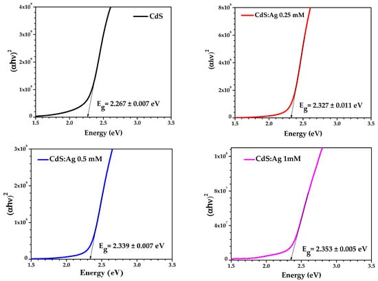 Figure 11 shows the linear approximations made to the absorption limit for the CdS and CdS:Ag samples. These approximations gave the optical forbidden bands and show that the lowest forbidden band was 2.267 ± 0.007 eV for the pristine CdS sample, and the highest was 2.353 ± 0.005 eV for the CdS:Ag sample doped to 1 mM. The Eg value of the CdS thin film of 2.267 ± 0.007 eV, which is relatively low compared to bulk CdS (2.42 eV), and may be associated with the short deposition time and position of the substrate in the reactor. This is in agreement with the work published by Ashok et al., and Ruiz-Ortega et al., who obtained values of 2.30 eV and 2.24 eV, respectively [7,36]; on the other hand, the increase in Eg of the CdS:Ag thin films with respect to the pure CdS thin film can be assigned to the defects generated by the dopant ions.
