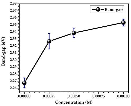 Figure 12 shows the dependence of the forbidden band on Ag concentration in CdS thin films. There is a tendency for the energy of the band gap to increase with increasing doping concentration, up to 2.353 ± 0.005 eV for the CdS:Ag 1 mM (0.001 M) sample. This behavior is attributed to the Moss–Burstein effect, because the dopant ions create interstitial defects that perturb the lattice of the crystal structure, enough to shift the Fermi level towards the conduction band, causing the band gap of the material to increase [44]. The defects generated at the edge of the conduction band are responsible for the enhancement in the band gap, as this allows the absorption edge to shift to shorter wavelengths, leading to higher energies. As a result, all energy levels near the conduction band edge are filled and the gap value is increased.