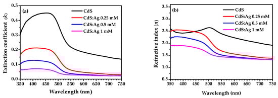 The variation of extinction coefficient (k) and refractive index (n) of CdS and CdS:Ag thin films for the wavelength range from 350 to 750 nm are shown in Figure 13a,b, respectively. These are explained by Equations (3) and (5), as described in Section 2.1.