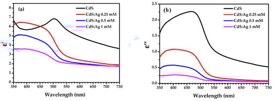 Figure 14 shows the variation of the dielectric constant () and dielectric loss () spectra as a function of wavelength in the visible spectrum, for CdS and CdS:Ag thin films. The complex dielectric function of the materials is represented by . Figure 14a shows the values of the dielectric constant in the range from 1.6 to 7. It is observed that the dielectric constant of the CdS thin film decreases with increasing Ag concentration in most of the visible spectrum. Above 550 nm, the dielectric constant is observed to reach a nearly constant value. The decrease in at longer wavelengths (low frequencies) can be attributed to the large electrostatic binding force, which arises due to space charge polarization near the grain boundary interfaces [56].