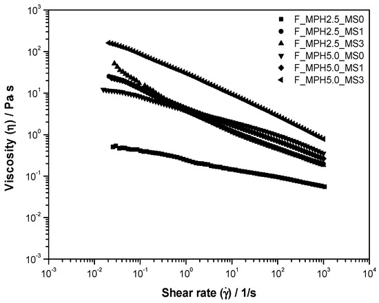 Different coating-forming solutions were prepared using different percentages of mango peel hydrocolloids and mango peel extracts (MSE360) (Table 1). The flow curves of the coating solutions are shown in Figure 1.