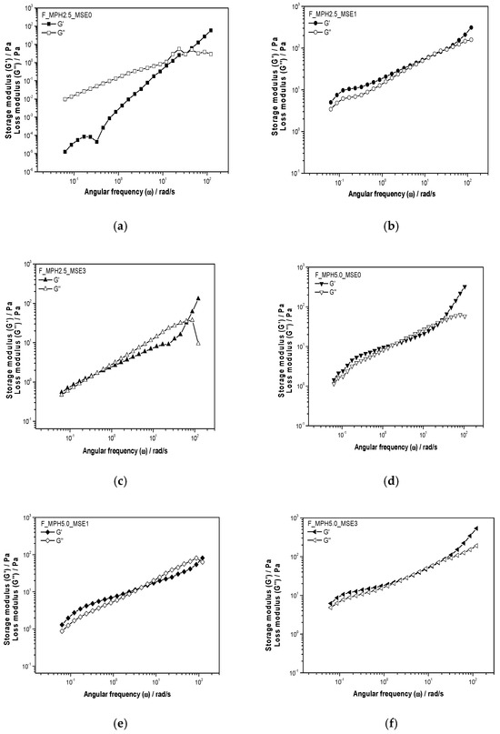 Figure 2 shows the loss () and storage () modulus as a function of angular frequency (rad/s). and increase proportionally to frequency, showing a strong dependence on angular frequency, characteristic of the formation of entanglements in the network of polymeric components that consolidate the structure [56]. For the control sample (F_MPH2.5_MSE0), was higher than at a low frequency, followed by a crossover at 30 rad/s and an inverse crossover frequency, indicating the elasticity of these fluids; then, the addition of mango peel extracts modified the behavior when was slightly lower than . In all cases, improving the elastic properties is a characteristic of a network system of intertwined macromolecules: molecular rearrangements are feasible, which gives these results at a low frequency [57]; as the frequency increased, a crossover was evidenced between and , known as the crossing point ( = ), in this case indicating that as the frequency increases, the lattice structure becomes more rigid and dense. This may be due to phenomena such as the aggregation of molecules, formation of hydrogen bonds, polymerization, and gelation. This greater rigidity in the lattice structure hampers the ability of the solution to store elastic energy, which is reflected in an increase in the loss modulus [55]. Therefore, at a high frequency, was observed more than ; similar behaviors have been observed in film-forming solutions based on different mixtures of hydrocolloids [53], in film-forming solutions composed of banana flour and hydrocolloids [58], and in a gel emulsion made from whey protein isolate and xanthan gum enriched with curcumin [59], suggesting that the extract used modifies the viscoelastic properties of film formation solutions.