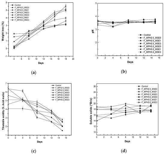 Samples with a higher percentage of hydrocolloids (F_MPH5.0_MSE0, F_MPH5.0_MSE1, and F_MPH5.0_MSE3) had lower weight loss values, and then the increase in hydrocolloids in edible coatings reduced the transfer of moisture, by producing a more resistant layer on the surface of the fruit. Similar behaviors have been observed in edible coatings for fruits with formulations of other hydrocolloids such as low methoxyl pectin, carboxymethylcellulose, persian gum, chitosan, and gum tragacanth [64,65]. Then, samples with a higher percentage of extracts (F_MPH2.5_MSE3 and F_MPH5.0_MSE3) showed lower weight loss values compared to samples that did not contain natural extracts (F_MPH2.5_MSE0 and F_MPH5.0_MSE0), this is due to the fact that natural extracts are hydrophobic in nature and their incorporation into edible coatings can control and reduce the respiration of fruits and with it the transpiration, moisture loss, and other processes that affect and influence weight loss. The results observed in this study are consistent with those reported by Hosseini et al. [66], who prepared edible coatings with the addition of savory and/or tarragon essential oils, applied to the fruits of kumquat and Tesfay and Magwaza [67], who designed edible coatings based on chitosan and CMC, with the addition of moringa leaf extract, applied to avocado fruit (Persea americana Mill.)