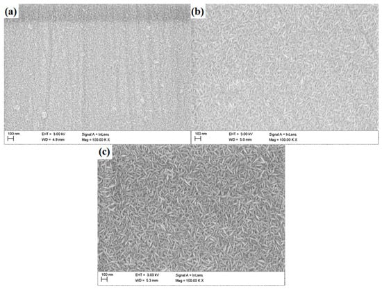 The observations performed with the use of the SEM revealed the granular morphology of the deposited coatings (Figure 2)—with grains of elongated shape, characteristic for zinc oxide, which represents the outer layer of each multilayer configuration. The grains were distributed randomly, with no dominant direction of their arrangement. With increasing number of layers deposited, an increase in grain size can be observed.