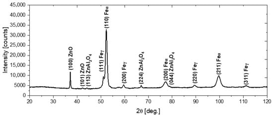 In order to characterize the structure of the deposited coatings, phase analysis using the X-ray diffraction method was performed, with the use of Co K-α radiation. Figure 4 shows the X-ray diffraction pattern obtained for the N72 coating deposited on the steel substrate. The diffraction peaks at 37.15° and 42.39° correspond to the (100) and (101) crystal planes of the hexagonal wurtzite-type ZnO (zincite, space group P63mc) [29,30]. Concurrently, the diffraction peaks at 44.27°, 67.01° and 79.13° can be assigned to the (114), (224) and (044) crystal planes of cubic ZnAl2O4 (gahnite, space group Fdm) [31,32]. As the penetration depth of X-rays into the material exceeds the thickness of the deposited coatings, the presence of α-Fe and γ-Fe peaks deriving from the steel substrate can also be observed [33,34].