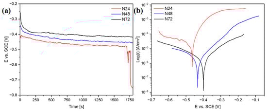 The corrosion resistance of the coatings was determined with the use of electrochemical tests. Figure 8a shows the changes of open-circuit potential as a function of time, whereas Figure 8b shows the recorded polarization curves. The open-circuit potentials for the samples N48 and N72 stabilized at approximately −420 mV and −450 mV vs. SCE, respectively. In the case of sample N48, a rapid decrease in potential during the first 130 s of measurement was observed—which can be related to the dissolution of impurities adsorbed on the surface. For sample N24, after 1700 s of measurement, there was a sharp decrease in potential, indicating that the continuity of the coating was breached; at the end of measurement, the potential reached a value of −750 mV. The characteristic corrosion resistance parameters obtained in effect of conducted measurements were summarized in Table 3.