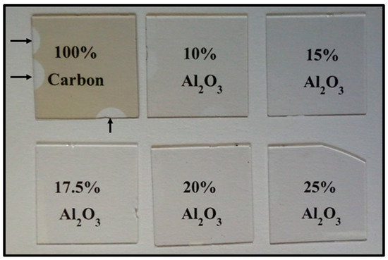 Undoped and Al2O3-doped DLC samples. Note: The black arrows highlight witness marks—areas of uncoated substrate—on the 100% carbon sample. These marks, caused by mounting hardware during deposition, were observed on all samples. The transparency of the films is illustrated by the underlying text.