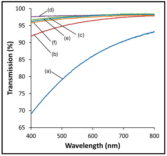Figure 2 illustrates the transmission spectra for each film. To facilitate a direct comparison of the films, given their varying thicknesses, attenuation coefficients were calculated at a wavelength of 450 nm. The thicknesses of the doped films, measured using white-light interferometry, were found to range from approximately 30 to 45 nm, as detailed in Table 2. For each of the films, the attenuation coefficients, as shown in Figure 3, were calculated following the methods of Manjunatha and Paul, using the Beer–Lambert law [37]: