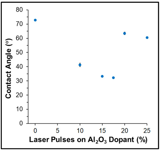 The effect of Al2O3 dopant on average water contact angle. Note: Error bars are included for each data point, but their small size makes them difficult to observe.