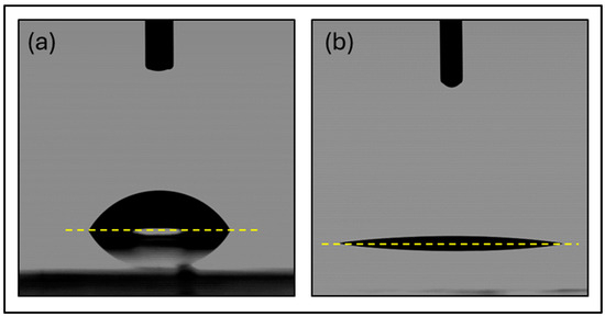 Representative water droplet profiles on 17.5% Al2O3-doped films: (a) An as-made film and (b) a plasma-cleaned film, imaged 60 min after treatment. Note: The yellow dashed line indicates the baseline for each measurement.