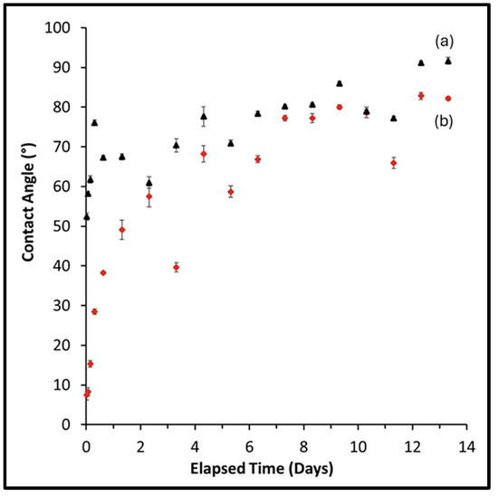To evaluate the temporal stability of the contact angles for both as-made and plasma-cleaned samples, measurements were performed over a 14-day period. The measurements were conducted at 24 h intervals, with more frequent readings during the initial stages of the experiment.