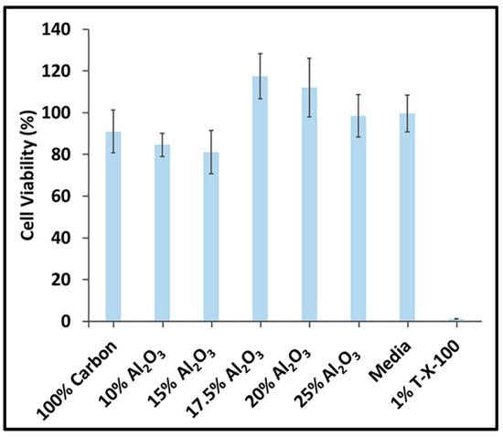 Figure 9 presents the ex vivo acute toxicity results of Al2O3-doped DLC films, evaluated 24 h following NIH/3T3 cell incubation. No comparisons among the tested samples generated p values equal to or below 0.05. Statistical analysis of the cell viability assay results revealed no significant differences between the experimental films and control media, demonstrating the films’ biocompatibility.