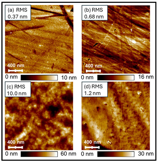 Atomic force microscopy (AFM) was employed to characterize the films’ morphology and roughness for both as-made and plasma-cleaned samples. The plasma-cleaned film was analyzed within 12 h of treatment. Measurements were obtained using a Dimension Icon AFM, operating in contact mode using the ScanAsyst feature of Nanoscope V1.2.0 software (Bruker Corporation, Billerica, MA, USA), over a 2 µm × 2 µm scan area at a scan speed of 10 µm/s and a resolution of 256 × 256 pixels. The data were subsequently analyzed using NanoScope Analysis V1.2.0 software.