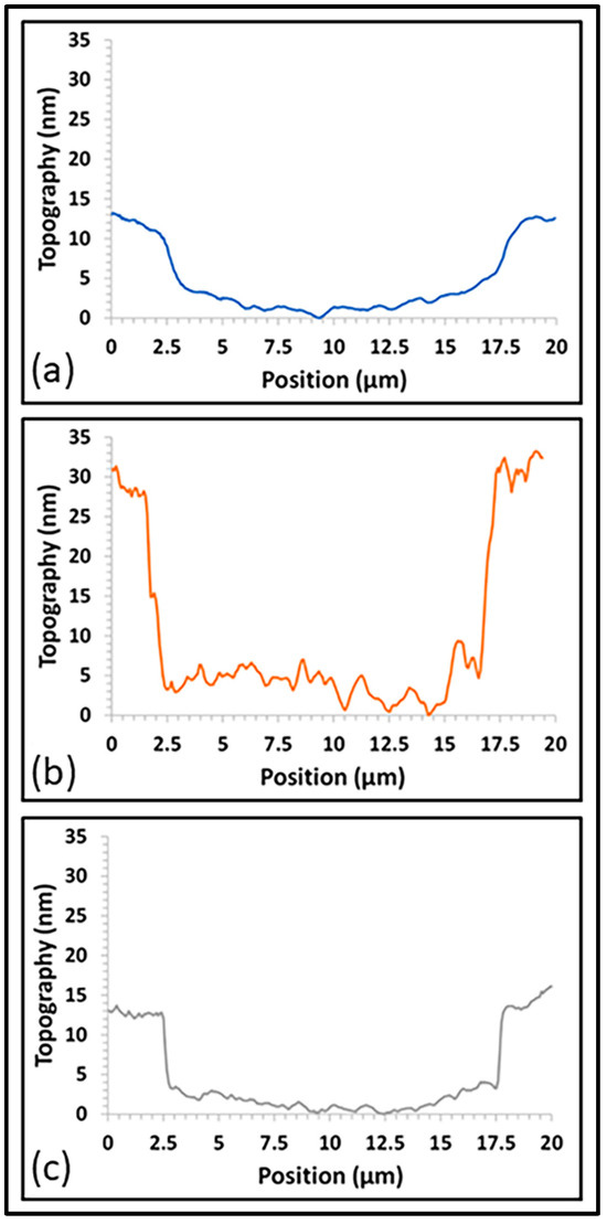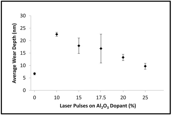 The addition of Al2O3 had a content-dependent effect on the wear depth of the films (see Figure 12). For laser pulse percentages on the target of less than 20%, the addition of Al2O3 resulted in deeper average wear depths compared to the non-doped film (17–23 nm vs. 7 nm, respectively). The shape of the wear depth cross-section was also different than that of the non-doped film; films created with 20% alumina pulses or less presented a more square-bottomed cross-sectional profile compared to the non-doped film, which presented a more rounded cross-sectional profile (see Figure 13a,b). The square-bottomed cross-sectional profile, combined with the deeper wear depth, is indicative of the test load moving through the majority of the film’s thickness. However, once the number of laser pulses on the Al2O3 target was at least 20%, the wear depth began to approach that of the non-doped film (13 nm at 20% dopant and 10 nm at 25% dopant), and a more rounded cross-sectional depth profile was seen (see Figure 13c). This suggests that there may be a minimum amount of Al2O3 needed in order to mitigate the influence of the dopant on the mechanical properties of the film. Further investigation is needed into whether an optimal dosage can be determined, with the expectation that the optimal dosage(s) may be application-dependent, given the need to prioritize multiple material properties.