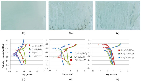 Sample appearance after 72 h SST of thin-SAA anodizing (4.3–4.7 µm) and 15 min sealing at room temperature with (a) Zr/F sealing at pH 5, (b) Mo sealing at pH 7.3, and (c) Ce sealing at pH 5.6. Potentiodynamic polarization curves of anodized aluminum alloy 2024 with (d) Zr/F, (e) Mo, and (f) Ce sealing.