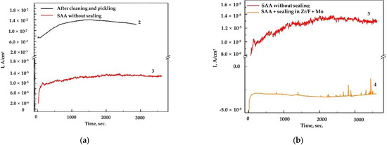 (a) The obtained chronoamperograms for AA2024, samples 2 (after cleaning and pickling) and 3 (SAA) at E = −0.400 V vs. Ag/AgCl (3M KCl); (b) sample 3 (SAA) at E = −0.400 V vs. Ag/AgCl (3M KCl) and sample 4 ((SAA + (Zr/F + Mo)) at E = −0.700 V vs. Ag/AgCl (3M KCl).