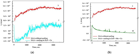 (a) The obtained chronoamperograms for AA2024, sample 3 (SAA) at E = −0.400 V vs. Ag/AgCl (3M KCl) and sample 7 ((SAA +(Zr/F + Ce)) at E = −0.700 V vs. Ag/AgCl (3M KCl); (b) sample 3 (SAA) at E = −0.400 V vs. Ag/AgCl (3M KCl) and sample 10 ((SAA + (Zr/F + Mo + Ce)) at E = −0.700 V vs. Ag/Ag/Cl (3M KCl).