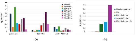 (a) Dependence of the polarization resistance Rp of the studied systems on time of exposure in 0.1 M NaCl, determined at Eocp; (b) variation of the polarization resistance (Rp) of the investigated systems over time during exposure to a corrosive environment (0.1 M NaCl), measured after chronoamperometric treatment at the breakdown potential (Epitt vs. Ag/AgCl (3M KCl)).