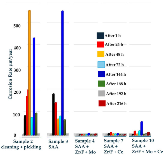 The results in Figure 9a show that sample 7 (SAA + Zr/F + Ce) exhibits the highest corrosion resistance (up to 216 h of exposure in the corrosive medium).