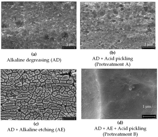The elemental composition of the AA2024 sheet substrates, determined by EDS analysis, is summarized in Table 8, while the SEM investigations are presented in Figure 11. Typical pretreatment procedures include alkaline degreasing followed by acid pickling or alkaline degreasing followed by both alkaline and acid pickling (Figure 12 and Figure 13a).