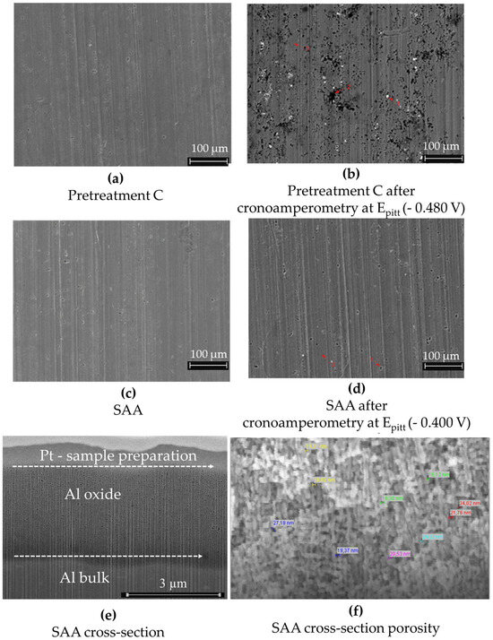 A focused ion beam (FIB) system (Quanta 200 3D, Thermal Fisher Scientific, Waltham, MA, USA) was employed to characterize the anodic layer, allowing precise cross-sectioning and high-resolution imaging for detailed analysis of the layer’s thickness, uniformity, and microstructural features. The samples were first cooled in liquid nitrogen before pore measurements were taken. This step ensured that the samples were brittle enough for precise cross-sectional analysis and accurate pore size evaluation.