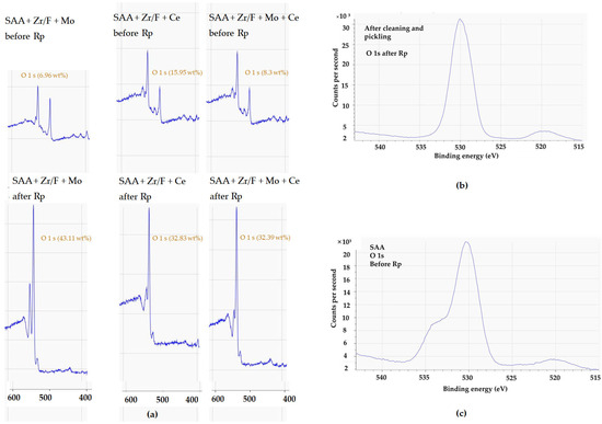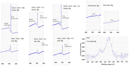 The results obtained for sample 4 (Zr/F + Mo) following the measurement of Rp indicate that, after 216 hr at Eocp, the top part of the conversion layer (up to ~5 nm in thickness) contained only Zr and at an increased concentration (20.77 wt%) from XPS analysis. The remaining characteristic elements of the conversion layer (Mo, F, K, Na, S, Fe) that were detected in the as-deposited sample were apparently present at lower depths of the conversion layer (exceeding 5 nm—the limit of detection of the XPS method), taking into account the EDS analysis for the sample with (Zr/F + Mo). A similar effect was established for sample No. 7 (Zr/F + Ce).