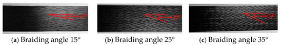 In this study, three types of 3D braided composites with braiding angles of 15°, 25°, and 35° were fabricated using three distinct braiding parameters. The angle between the woven yarn and the longitudinal axis is referred to as the “knitting angle”. As the braiding angle increases, the applied force also increases. When the shearing force becomes excessive, the friction between the fiber and the shearing mechanism intensifies, leading to more severe yarn damage. This results in a deterioration of the composite’s mechanical properties and an increase in the uncertainty of the test results. Therefore, the maximum braiding angle of the 3D braided composite test specimens in this study was 35°. Three braiding angles (15°, 25°, and 35°), equally spaced, were chosen to investigate the effect of braiding angle on the mechanical properties of 3D braided composites. The test specimens with these braiding angles are shown in Figure 2.