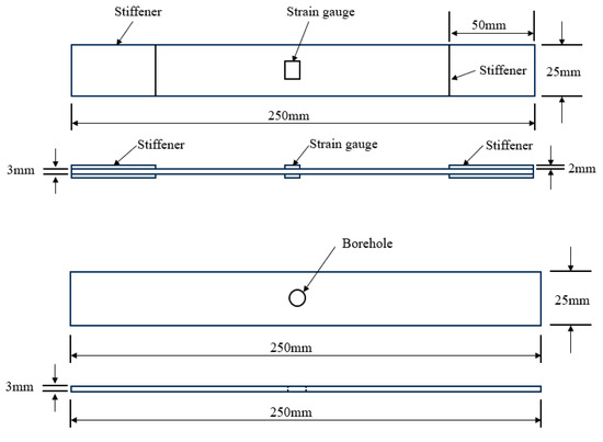 Standard test specimens were prepared in accordance with ASTM D3039 and ASTM D5766, and tensile tests were conducted on both non-porous and perforated specimens to determine their tensile strength and modulus. The dimensions and geometry of the test specimens are shown in Figure 4. For the tensile tests on test specimens without open holes, the clamping friction force was increased to mitigate early damage caused by stress concentration at both ends of the specimen. This increase in friction helped prevent slippage during the test. The clamping surfaces at both ends of the specimen were polished, and reinforcing plates made of 6061-T6 aluminum alloy were affixed to the ends of the specimen. Due to the intentional introduction of damage and stress concentration, no reinforcing plates were attached to the specimens with open holes.