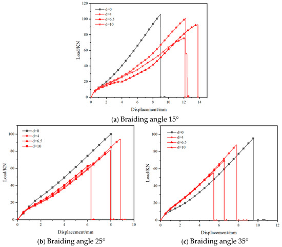 Figure 6 presents the tensile load–displacement curves of the 3D braided composites with varying braiding angles and aperture sizes. As shown in Figure 6, the peak load of the open-hole specimens decreased with an increase in the aperture size, suggesting that the aperture size has a significant detrimental effect on the static tensile properties of the 3D braided composite. The load increased progressively with time during stretching. Once the peak load was reached, the load–displacement curve exhibited a sudden drop, resembling a “clipping” pattern. As the stress approached the tensile limit, the interwoven yarns fractured sequentially. As the crack propagated toward the yarn, the significant load-bearing capacity of the braided yarn delayed further the crack propagation. However, once the yarn’s load-bearing capacity was surpassed, the yarn fractured, and the stress reached the tensile strength limit, leading to specimen failure.