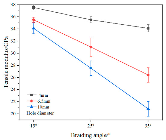 The 3D braided composites exhibited varying load-bearing capacities under the tensile stress. Figure 7 illustrates the tensile modulus of the 3D braided composite specimens with different braiding angles and aperture sizes. As shown in Figure 7, the tensile modulus decreased with the introduction of an open hole, and the sensitivity of the tensile modulus to the aperture increased significantly as the hole size enlarged. The tensile modulus of the 3D braided composites decreased as the braiding angle increased. This is because, with a higher braiding angle, the inclination angle of the braiding yarn also increased, which led to an increase in the axial angle of the yarn. In turn, it reduced the axial mechanical properties of the carbon fiber and increased the deformation of the 3D braided composite under the tensile loading. Compared with the decrease in tensile modulus observed at the three braiding angles, the rate of decrease became more pronounced as the braiding angle exceeded 25°. This behavior can be attributed to the change in the failure mode of 3D braided composites. As the braiding angle increased, interface debonding became the predominant failure mode, causing the specimen to fail more rapidly under the tensile loading. Consequently, the tensile modulus was significantly influenced at higher braiding angles.