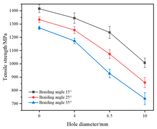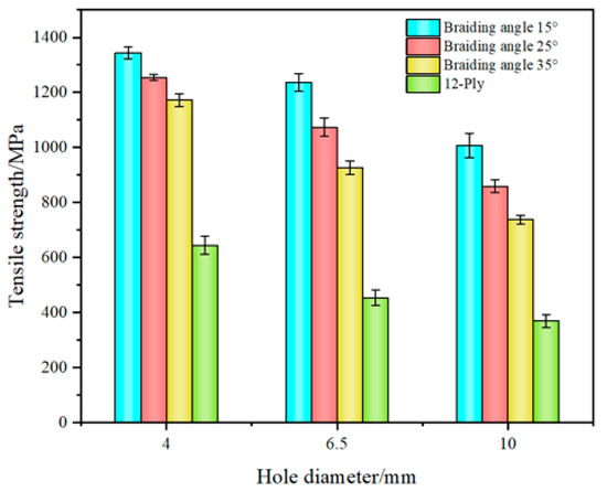 Figure 8 illustrates the tensile strength of the 3D braided composites with varying apertures and braiding angles. The tensile strength exhibited a clear decrease as the pore diameter increased. However, the strength reduction in test specimens with different braiding angles showed varying sensitivities to drilling. Specifically, the strength reduction of the specimens with a 4 mm diameter at 15°, 25°, and 35° braiding angles was 5%, 5.89%, and 7.76%, respectively. At 15°, 25°, and 35°, the strength reduction of the specimens with a 6.5 mm diameter was 12.64%, 19.42%, and 27.11%, respectively. The same trend was observed for the 10 mm aperture specimens. As the braiding angle increased, the strength of the specimens became more sensitive to drilling. This was primarily due to the fact that as the braiding angle increased, the mechanical properties of the carbon fiber along the axial direction of the composite material degraded, leading to a shift in the failure mode from fiber fracture to interface debonding. The reduction in tensile strength exhibited distinct trends as the hole diameter varied. For the same braiding angle, the rate of tensile strength reduction increased with the aperture size. When the aperture was 4 mm, the tensile strength of the specimen with a 15° open hole decreased by only 5%, whereas the tensile strength of the specimens with 25° and 35° braiding angles decreased by 5.89% and 7.76%, respectively. In comparison to the 4 mm diameter, the tensile strength of the specimens with braiding angles of 15°, 25°, and 35° decreased by 8.03%, 14.38%, and 20.98%, respectively. When compared with the 10 mm diameter, the tensile strength of the specimens with braiding angles of 15°, 25°, and 35° decreased by 18.48%, 20.02%, and 20.32%, respectively. This phenomenon can be attributed to the stress concentration around the edge of the hole induced by the drilling process. As the aperture increases, the opening volume grows exponentially. For smaller apertures, the interwoven structure of the braided yarns remained relatively intact, and the movement between individual yarns was still constrained. As the aperture increased, the cross-structure of the braided preforms was significantly compromised during the drilling process, resulting in an inability to withstand the stress concentration around the opening under high tensile loading. It can be concluded that the tensile strength decreases significantly with an increase in pore size. For test pieces with varying braiding angles, smaller aperture openings were more effective in resisting higher stress concentrations around the hole, and as a result, the tensile strength remained largely unaffected by the presence of the opening.