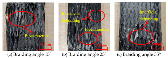 - When the braiding angle increased from 15° to 25°, the failure mode of the 3D woven composite changed from fiber fracture failure to the simultaneous occurrence of fiber fracture and interfacial debonding. When the braiding angle further increased to 35°, its failure mode transformed into interfacial debonding.
