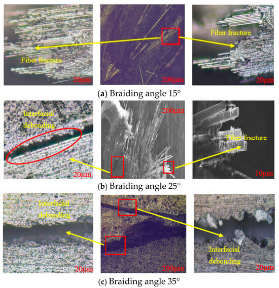 From the enlarged details of the damage, it was observed that a large number of fiber fractures occurred in the test piece with a 15° braid angle, as shown in Figure 11a, resulting in cluster fractures. The surfaces of the broken fibers remained relatively smooth, and no fragmented matrix material was observed. Figure 11b shows that, in addition to fiber fracture damage in the test piece with a 25° braiding angles, the poor adhesion between the fiber interfaces of different fiber bundles led to interface debonding. Figure 11c shows that the large braiding angle of the 35° test piece weakened the interface adhesion between the fiber and the matrix, leading to significant interface debonding damage within the test piece. During the stripping process, the resin matrix deformed, causing failure and adhesion to the surface of the fiber bundles. The images demonstrate that the three types of 3D braided composites without open holes exhibited distinct damage patterns at different braiding angles.