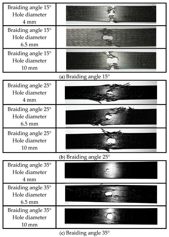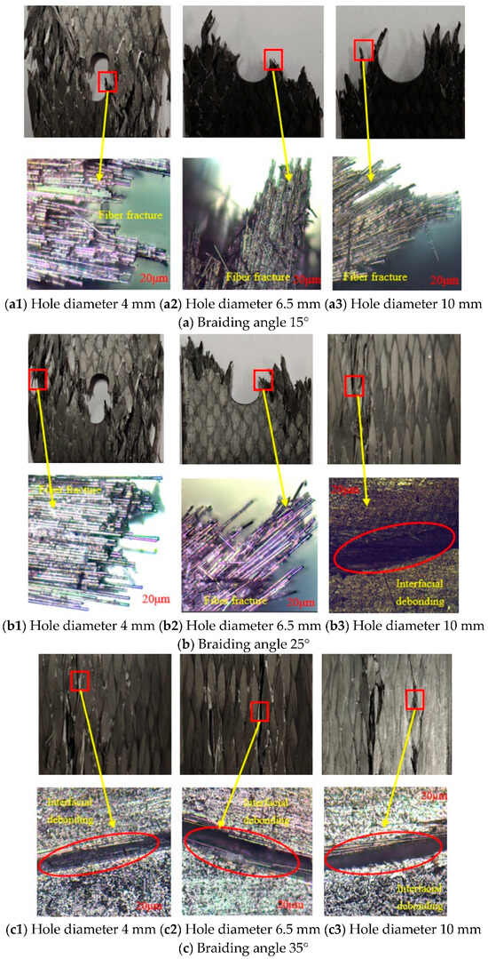 Figure 14 shows the damage magnification diagram of the test parts with different boreholes. Due to the low braid angle of the 15° test piece, it can be seen from the damage magnification detail diagram that the main damage mode was fiber fracture. With the increase in the hole diameter, the fiber was broken in clusters with a small hole diameter to disorderly fracture with a large hole diameter. The main reason for this phenomenon is that the effective area of the pore decreases with the increase in the pore diameter. Under the action of tensile load, the stress at the edge of the pore becomes more concentrated, and the fiber fracture becomes more disordered at the moment of failure. However, with the increase in aperture, the main failure mode does not change. Two failure modes occurred in the 25° test piece at all three pore diameters. The fiber fracture was more obvious at smaller pore diameters. With the increase in the pore diameter, more of the disadhesion phenomenon began to appear on the interface. In the 35° test, the interface desticking damage mode was displayed under three kinds of aperture, and the main damage mode did not change significantly with the increase in aperture. It can be concluded that the aperture factor has no obvious effect on the damage mode.