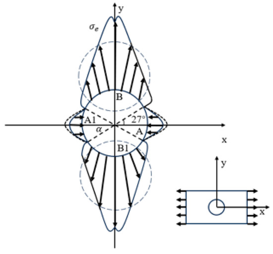 Three-dimensional braided composites have a periodic single-cell structure and can be regarded as orthotropic materials. As shown in Figure 13, according to the Lekhnitskii theory, under the action of unidirectional load (along the direction of the maximum elastic modulus), the maximum stress around the hole appears at the junction of the Y-axis and the hole (point B), and the stress concentration coefficient is . The minimum stress occurs at the junction between the X-axis and the hole.