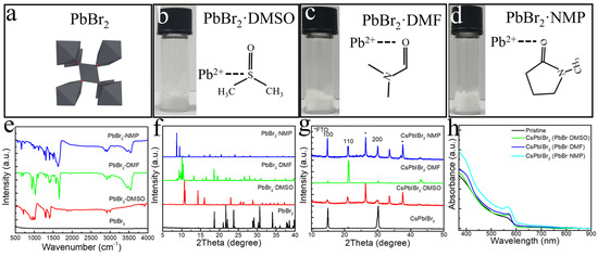 Solvent-mediated complexation and structural characterization of CsPbIBr2 perovskite films. (a–d) Photographs and schematic diagrams showing the PbBr2 precursor (a) and corresponding intermediate complexes formed with different solvents: (b) PbBr2·DMSO, (c) PbBr2·DMF, and (d) PbBr2·NMP. (e) FTIR spectra confirming the formation of intermediate complexes between PbBr2 and solvents (DMSO, DMF, and NMP). (f) X-ray diffraction (XRD) patterns of PbBr2 complexes (PbBr2·DMSO, PbBr2·DMF, PbBr2·NMP) demonstrating varying degrees of crystallinity. (g) XRD patterns of CsPbIBr2 perovskite films prepared from different solvent complexes under identical conditions (annealed at 150 °C for 10 min). The diffraction peaks correspond to the tetragonal phase of CsPbIBr2. Differences in peak sharpness and intensity indicate solvent-dependent crystallinity and preferred orientation. (h) UV–Vis absorption spectra of CsPbIBr2 perovskite films prepared from various solvent-based complexes, highlighting the superior optical absorption of the CsPbIBr2·NMP film.