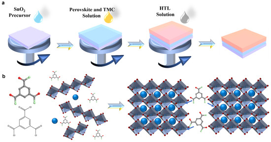 Fabrication process and molecular doping mechanism of CsPbIBr2 perovskite solar cells. (a) Schematic representation illustrating the stepwise preparation of CsPbIBr2 perovskite films via spin-coating. (b) Molecular structure and detailed passivation mechanism of TMC molecules in CsPbIBr2 perovskite films.