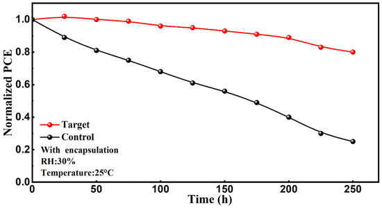 The operational stability of the Target device compared to the control device was systematically evaluated under ambient conditions (relative humidity: ~30%, temperature: ~25 °C), as depicted in Figure 5. Both device groups were encapsulated to minimize extrinsic degradation effects. The optimized device exhibited outstanding stability, retaining approximately 80% of its initial PCE after 250 h of continuous storage in ambient conditions. In sharp contrast, the control device underwent a pronounced decline in performance, retaining only about 40% of its initial efficiency within the same timeframe. This remarkable improvement in stability can be attributed to the effective defect passivation and suppression of ion migration provided by the molecular doping strategy with TMC. By significantly reducing surface and grain boundary defects, the optimized film morphology substantially minimizes the degradation pathways and prolongs the operational lifetime of the perovskite devices.