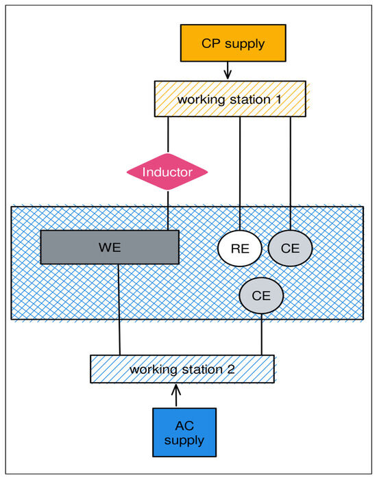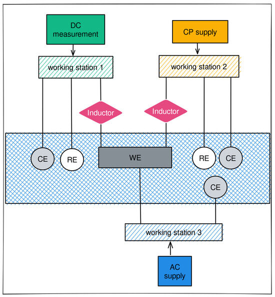 A schematic diagram of the electrochemical measurement and weight loss measurement of the pipe steel under various AC and CP conditions is shown in Figure 2. The DC circuit was executed by the Reference 600+ working station (from Gamry company at Warminster, PA, USA) (working station 1) with a three-electrode system consisting of a mounted metal coupon as the working electrode (WE), a saturated calomel as the reference electrode (RE), and a platinum sheet as a counter electrode (CE). In the AC circuit, a constant sine-wave AC with a frequency of 60 Hz was applied via the Virtual Front Panel (VFP) from another Gamry Reference 600+ working station (working station 2). The inductor element (10 Henries) was designed to prevent the AC from being released into working station 1. Also, working station 2 has built-in capacitor components to block the DC signals. The galvanostat applies a fixed CP current density on the working electrode, with DC potential as a response.