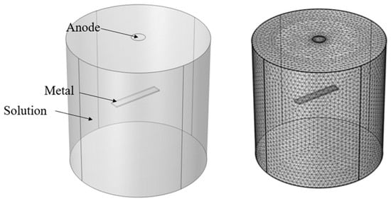 A three-dimensional finite element model was created using COMSOL Multiphysics software (version 6.2) based on the laboratory testing conditions, as shown in Figure 4. The large cylinder represented the solution, and the small cuboid solid inside was the metal coupon, which was the cathode in this analysis. The diameter and height of the cylinder were 7 cm and 15 cm, respectively. The metal coupon was 7.6 cm long, 1.3 cm wide, and 0.16 cm thick. The diameter of the anode surface was 1 cm. The free tetrahedral mesh was applied to the model, and the mesh size of the extra fine mesh was selected in modeling based on the convergence analysis. There were a total of 328,381 elements.