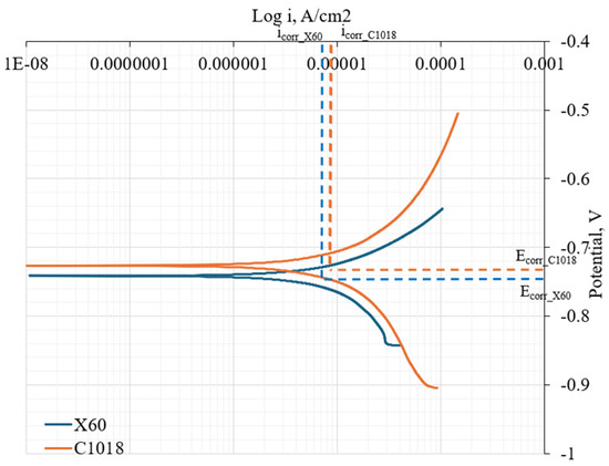 To characterize the electrochemical reactions on the metal surface, the polarization curves of the C1018 and X60 pipe steel were used as the boundary conditions for the cathode surface. This approach aligns with the methodology suggested in another simulation study conducted using COMSOL [27]. These polarization curves were obtained by instantaneously recording the direct current (DC) current density when changing the DC potential with a speed of 0.2 V/s in the laboratory experiments. An electric conductivity of 20 mS/cm was used for the solution, the same as was used in the laboratory experiment. The polarization curves in Figure 5 show that X60 pipe steel has a more negative corrosion potential than C1018 steel, indicating a greater thermodynamic tendency for corrosion. However, C1018 steel exhibits a higher corrosion current density, indicating a faster corrosion rate.