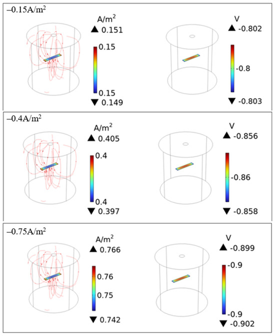 The reference electrode in this study was a saturated calomel electrode (SCE). The anode surface was set as an electrolyte potential surface with a potential value of 0 V vs. SCE. A CP current density was applied to the metal surface at −0.15 A/m2, −0.4 A/m2, and −0.75 A/m2, respectively.